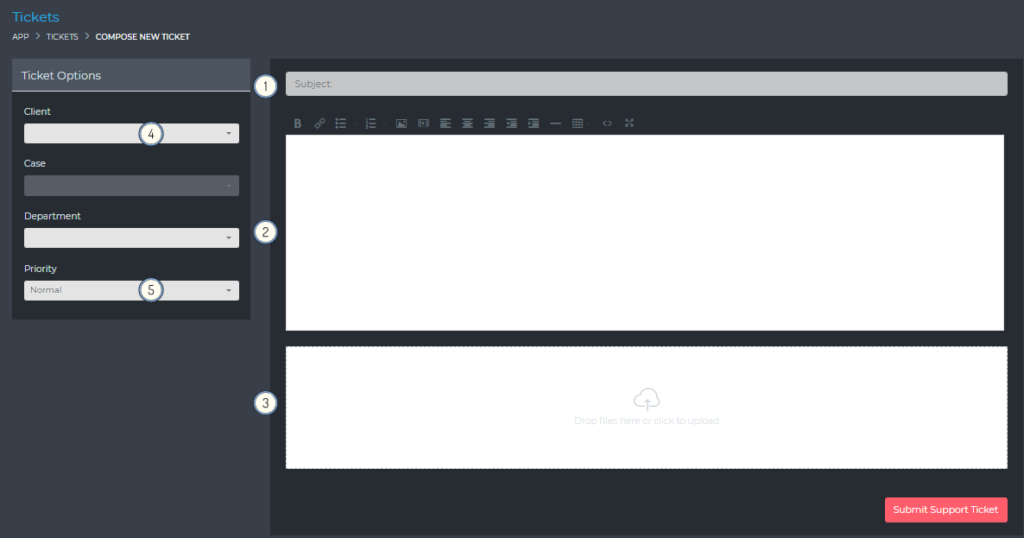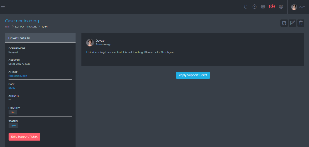 The image below shows the support ticket view. You are able to reply, change departments, change the priority, and attach files.