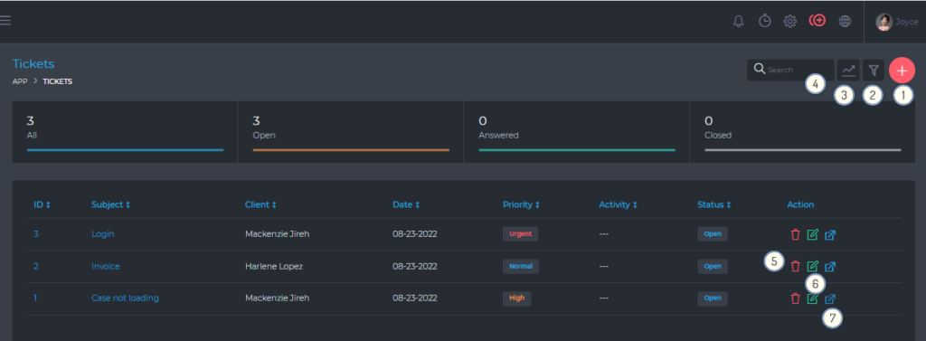 - (2) Filter tickets, using a detailed filter panel. You can filter tickets by dates, statuses, etc.