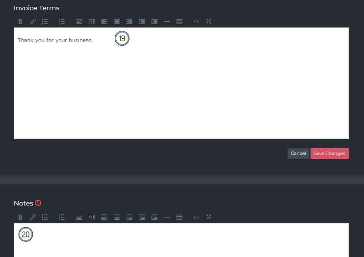 - (19) Terms & ConditionsDefault terms and conditions can be changed via the dashboard setting section. You can also change them on an invoice-by-invoice basis.