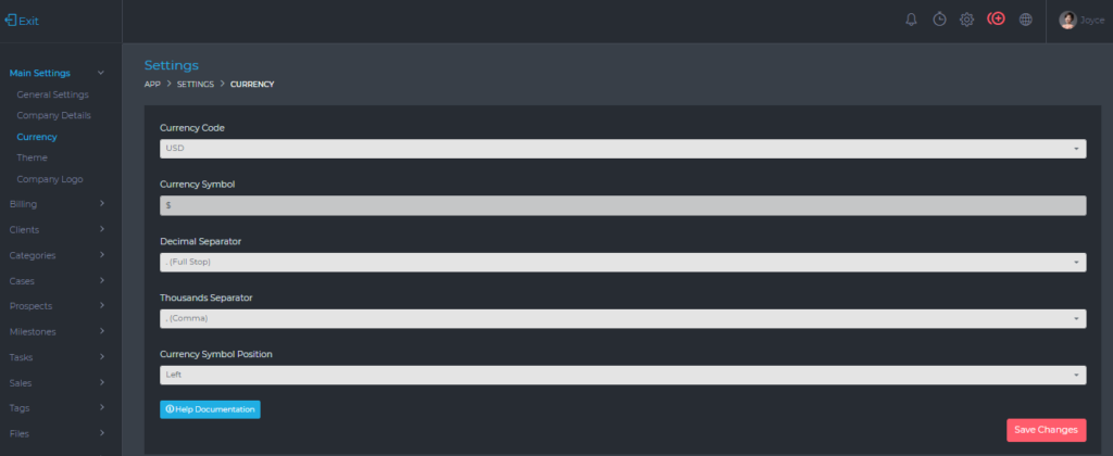 This is the currency that will be used for all billing in the application (e.g. Invoices, Estimates, etc).