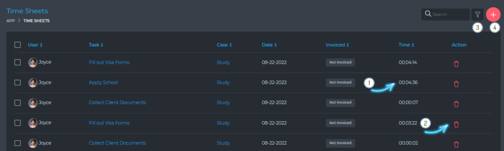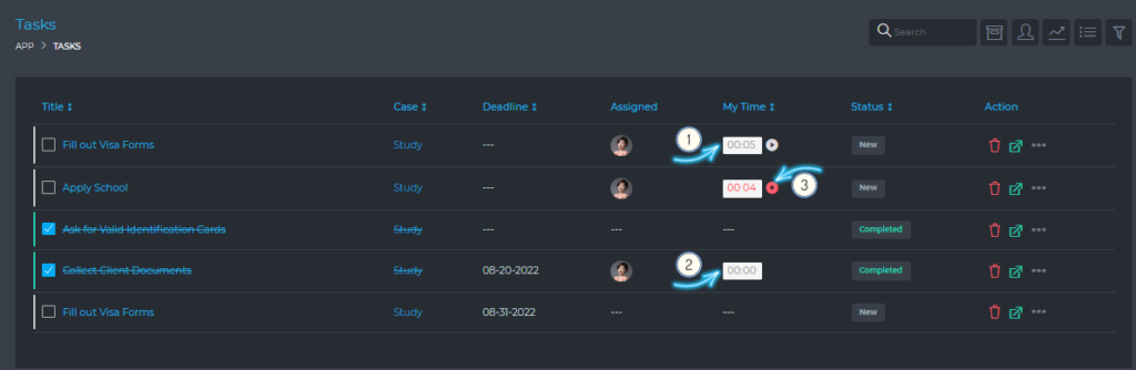 - (3) This is a task that you are currently working on and the timer is running. You can stop this timer by simply clicking the stop icon.
