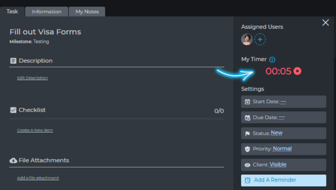 You are also able to start and stop a timer from inside the task window, as shown below.