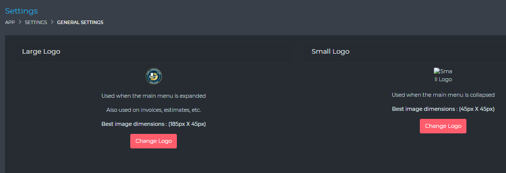 - Small Logo – This is normally your logo icon. The ideal size if (45px X 45px). This logo is used when the dashboard menu is collapsed.